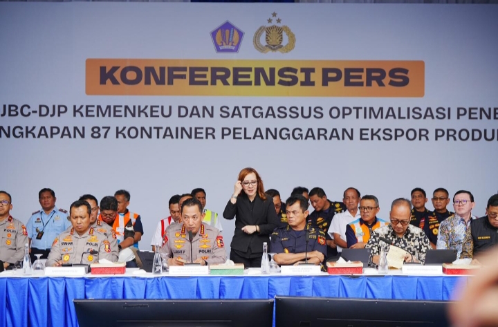 Jakarta – Kapolri Jenderal Listyo Sigit Prabowo menghadiri konferensi pers operasi gabungan DJBC-DJP Kemenkeu dan Satgassus Optimalisasi Penerimaan Negara Polri terkait temuan 87 kontainer pelanggaran ekspor produk turunan CPO (Crude Palm Oil) di TPS Multi Terminal Indonesia – NPCT Common Area, Tanjung Priok, Jakarta Utara, Kamis (6/11/2025).