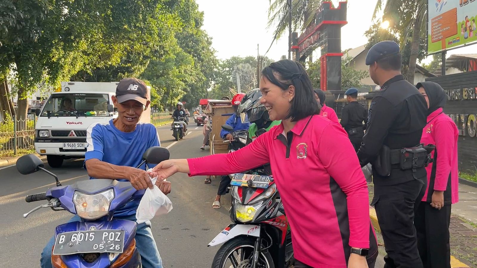 Personel Brimob dan ibu-ibu Bhayangkari tampak kompak turun ke jalan membagikan ratusan paket takjil kepada para pengguna jalan dan warga sekitar yang melintas. Aksi sosial ini mendapatkan sambutan hangat dari masyarakat yang kebetulan sedang dalam perjalanan menjelang waktu berbuka puasa.