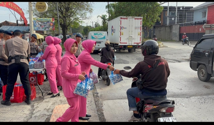 Cikarang – Kehadiran personel Batalyon D Pelopor Satuan Brimob Polda Metro Jaya bersama Bhayangkari mewarnai suasana sore di Jalan Raya Tegal Danas, Cikarang Pusat, (3/3/2026). Menjelang waktu berbuka puasa, personel Brimob membagikan takjil kepada masyarakat dan pengguna jalan yang melintas, menciptakan suasana hangat di tengah aktivitas warga.